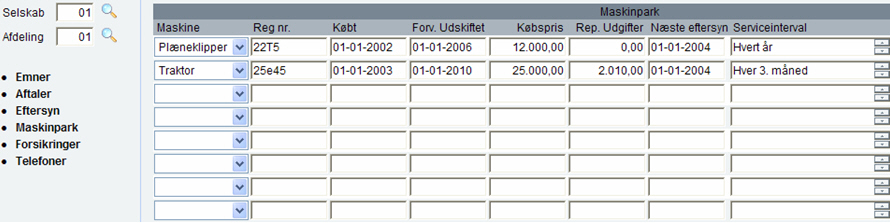 Under Afdeling-Aftalekartotek, er det muligt at registrere de Aftaler, Eftersyn, Maskinpark, forsikringer og telefoner der er tilknyttet afdelingen.